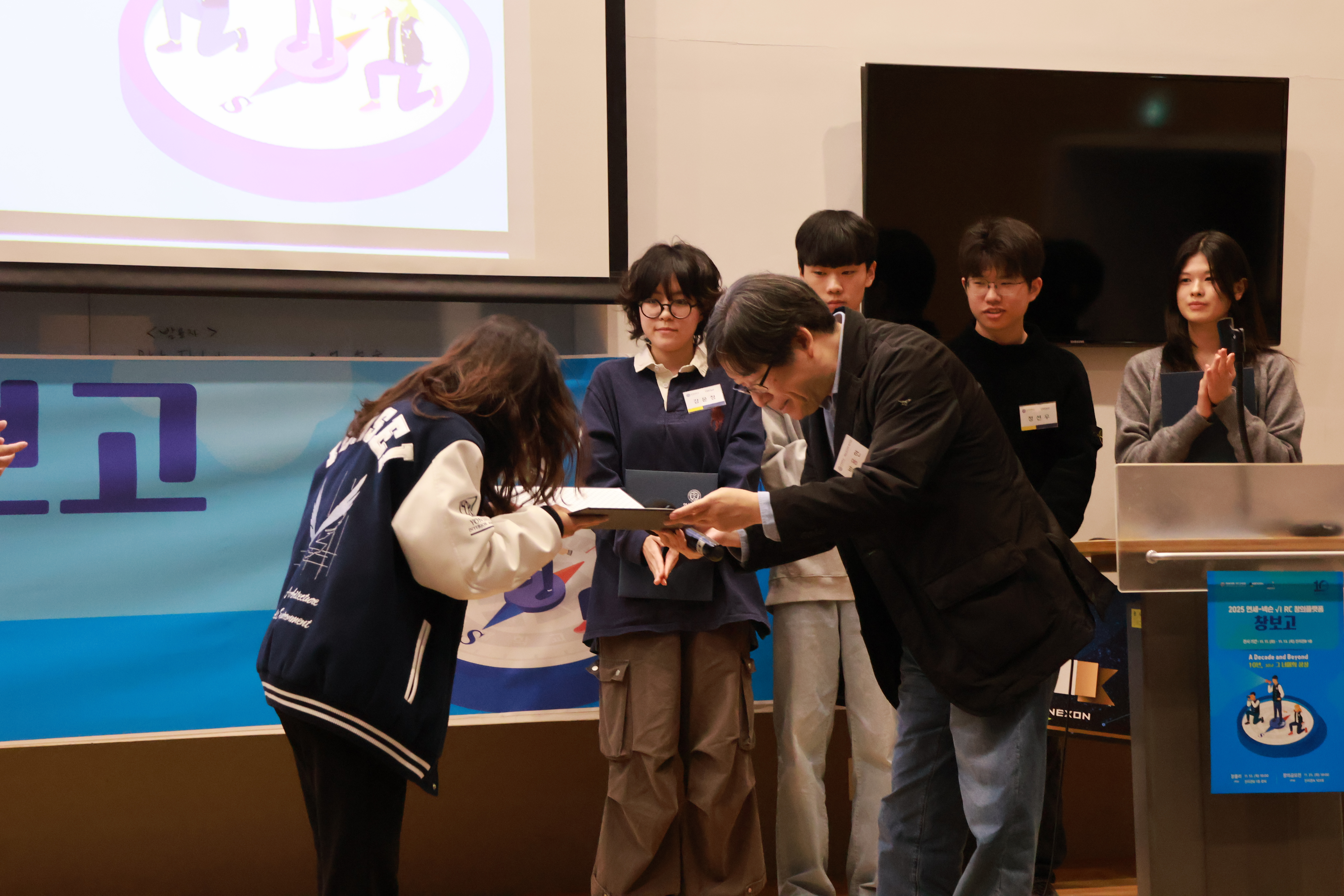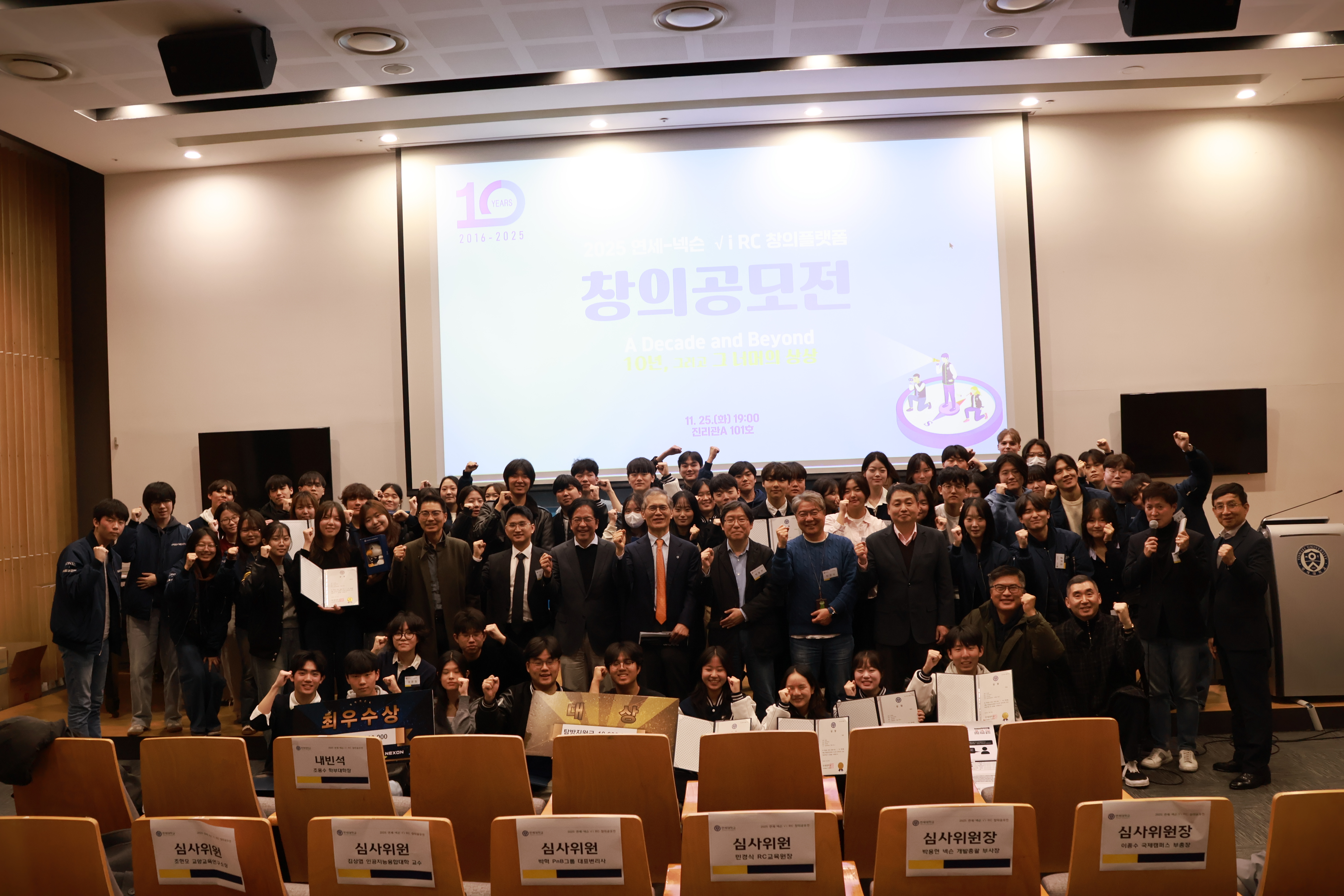 2025년 11월 25일(화) 오후 7시, 연세대학교 국제캠퍼스 진리관A 101호에서 연세-넥슨 √i RC 창의플랫폼 창의공모전 본선 발표 및 시상식이 개최되었다. 본 행사는 창의플랫폼이 지난 10년의 여정을 돌아보며 기념하는 자리인 동시에, 열 번째 해를 맞은 창의공모전의 수상작 5개 팀을 최종 선정하는 본선 무대로 진행되었으며, 부제는 ‘10년, 그리고 그 너머의 상상(A Decade and Beyond)’으로 정하고 개최되었다.